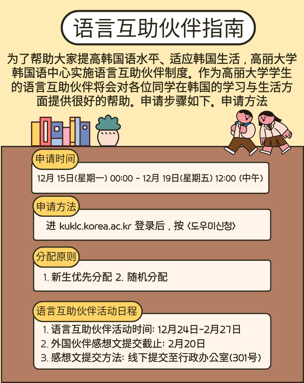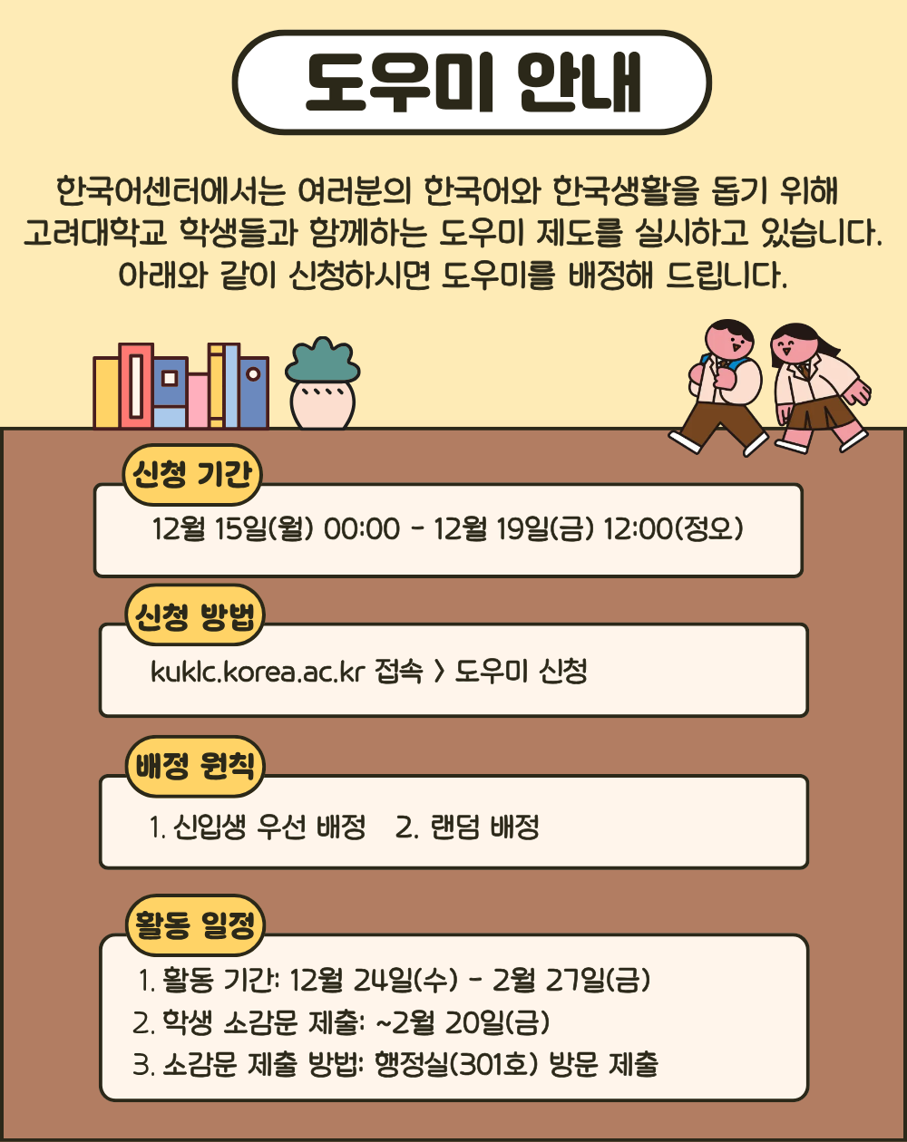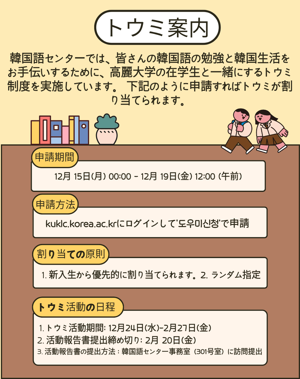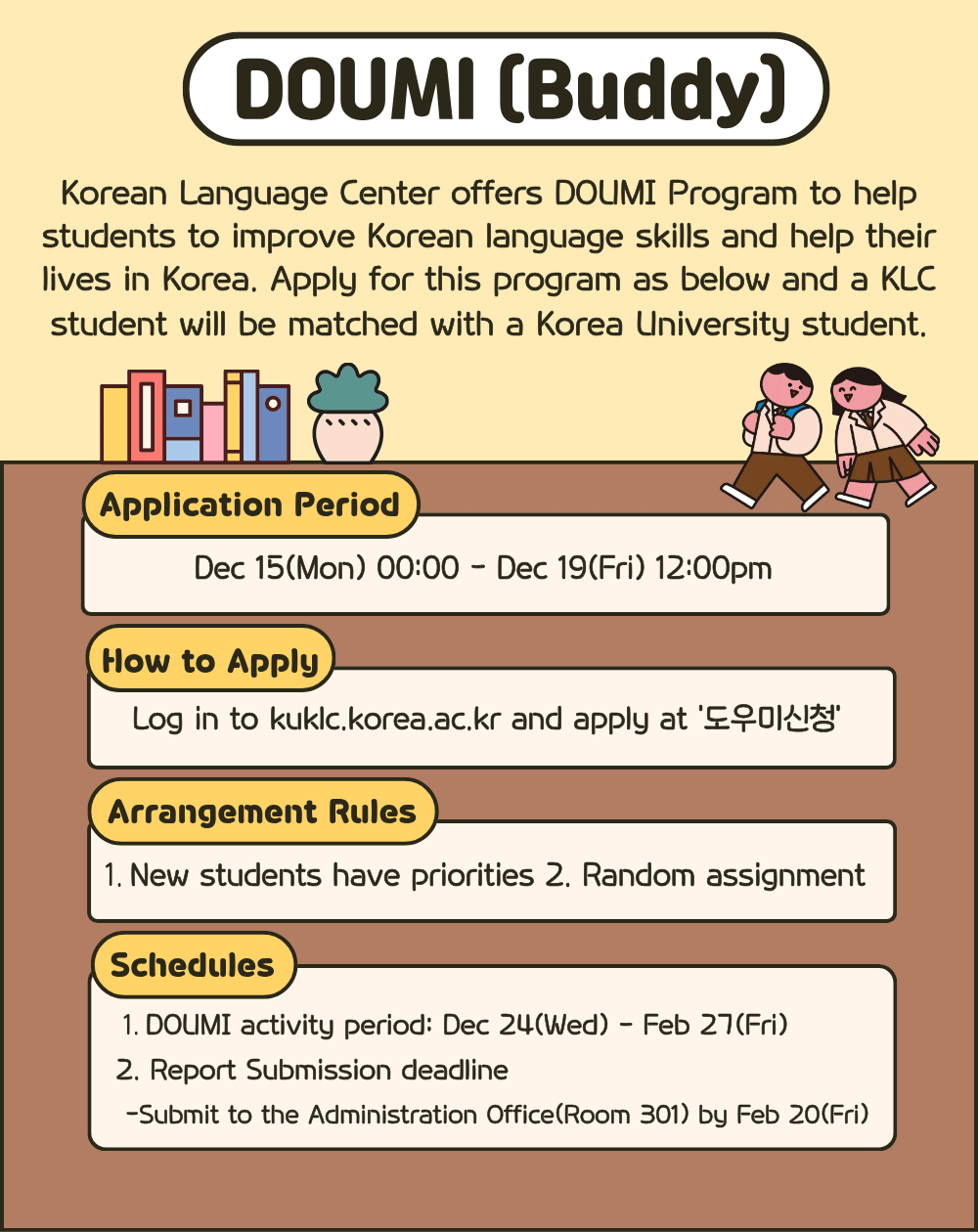 2025학년도 정규과정 겨울학기 도우미 모집 안내 / DOUMI (Buddy) for 2025 Winter Semester / 2025正规课程冬季学期语言互助伙伴指南 / 2025学年度正規課程冬学期トウミ募集のご案内 |